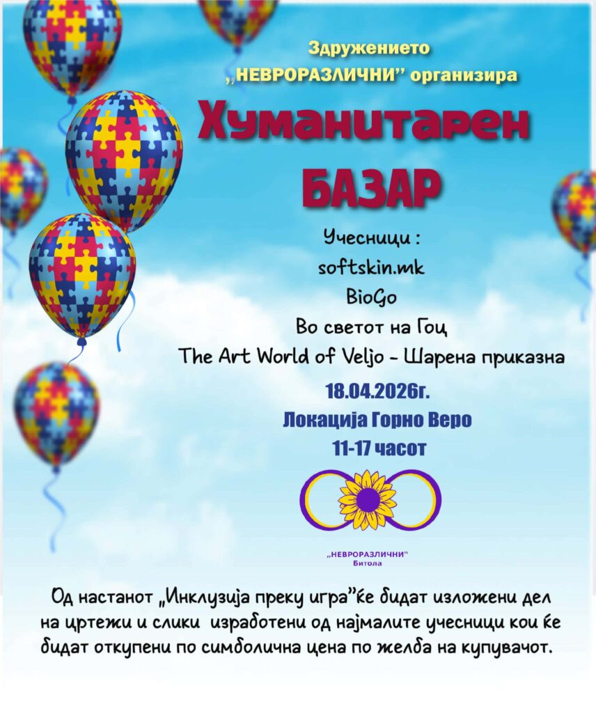 Здружението „Невроразлични“ од Битола организира хуманитарен базар кој ќе се одржи денес, на 18 април 2026 година, во просториите на Горно Веро, во периодот од 11 до 17 часот. Настанот има за цел да ја поттикне свеста за инклузија и да обезбеди поддршка за децата со невроразличен развој.
