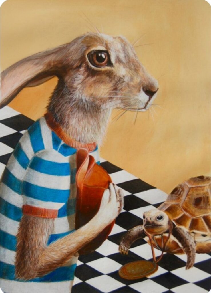 „Желката го тужи зајакот бидејќи ја претицал во бавно одење. А факт било (оти сите знаеле) дека таа најбавна е.“