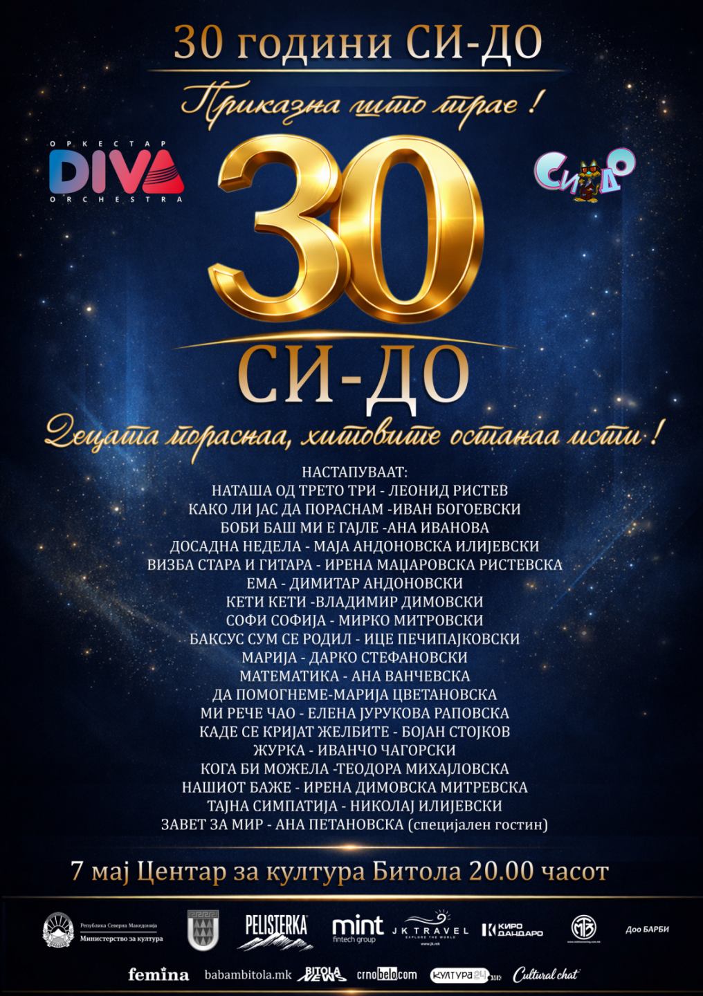 На 7 мај, во Центарот за култура, ќе се одржи свечен концерт по повод 30-годишниот јубилеј на СИДО. Овој концерт ќе донесе на едно место музика, спомени и емоции, и ќе ѝ овозможи на публиката повторно да ги доживее песните со кои израснаа многу генерации.