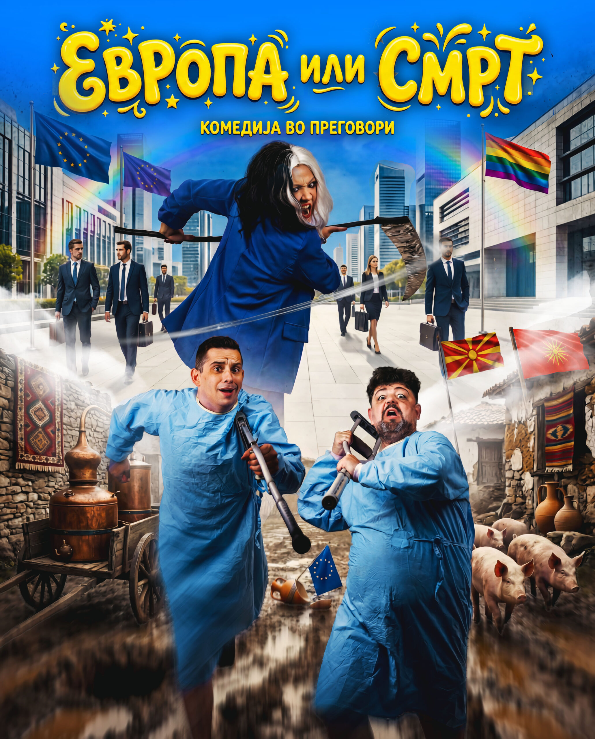 По подолга пауза, актерите препознатливи по комедии, видеа, скечеви и филмови, повторно се враќаат таму каде што е најживата енергија. На театарската сцена. Нивниот нов проект, театарската претстава со работен наслов „Европа или смрт“, претставува динамична и актуелна сценска приказна која ја отсликува денешницата низ призма на балканскиот менталитет.